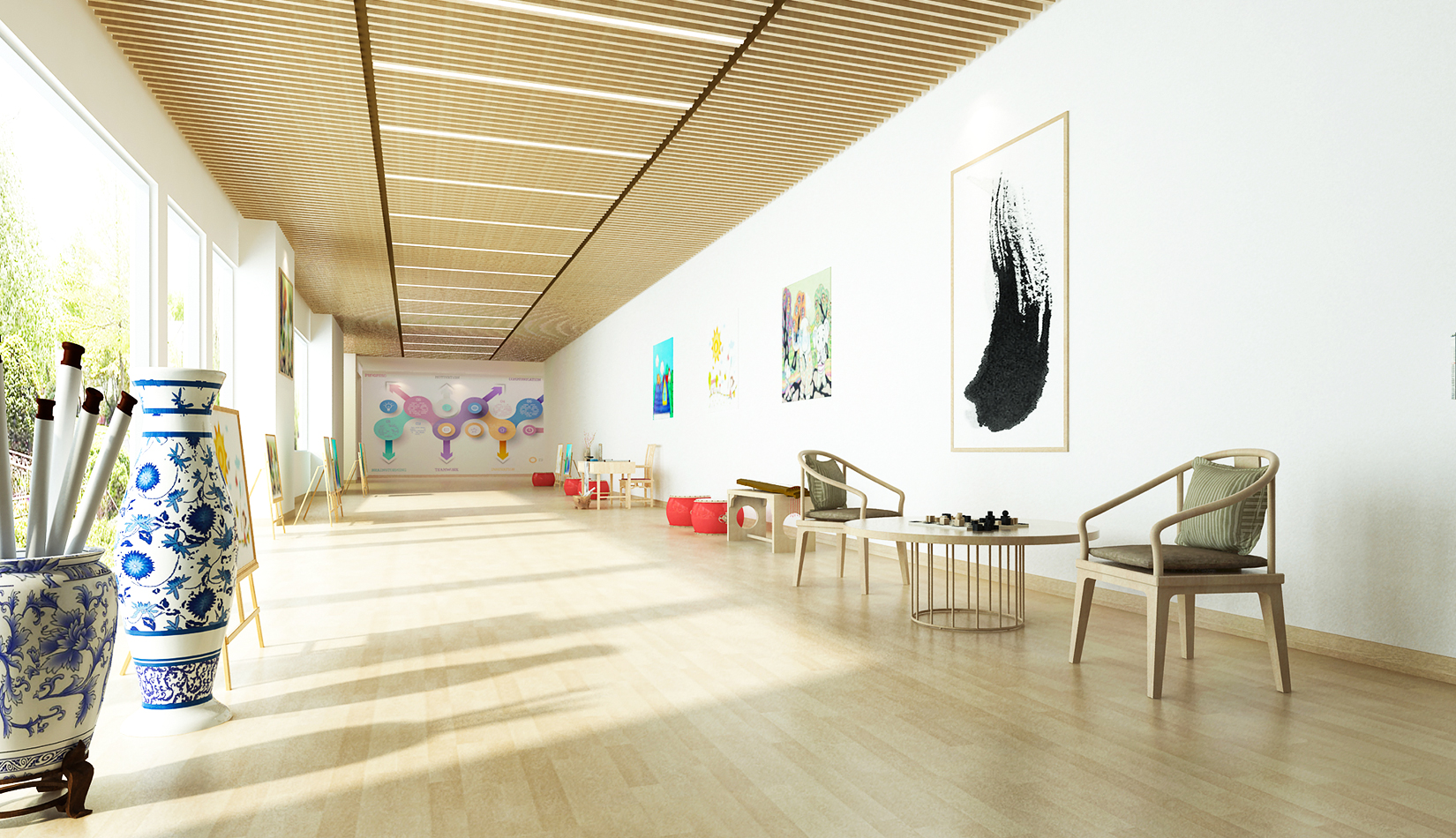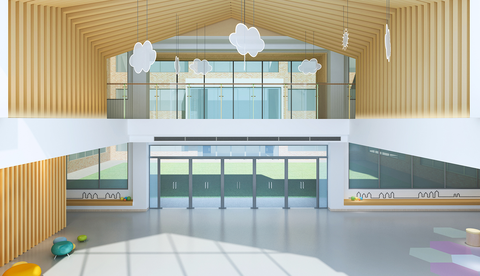 室內(nèi)延續(xù)建筑,空間內(nèi)部采光非常好。設(shè)計(jì)簡(jiǎn)潔、現(xiàn)代,以白色為主色調(diào),搭配淺木色作為室內(nèi)顏色?;顫?、好動(dòng)、天真、可愛是兒童最大的特點(diǎn),在其具體功能空間設(shè)計(jì)中,我們把這些特點(diǎn)和空間色彩結(jié)合起來,不同的空間根據(jù)其使用功能,采用了不同的色彩搭配。