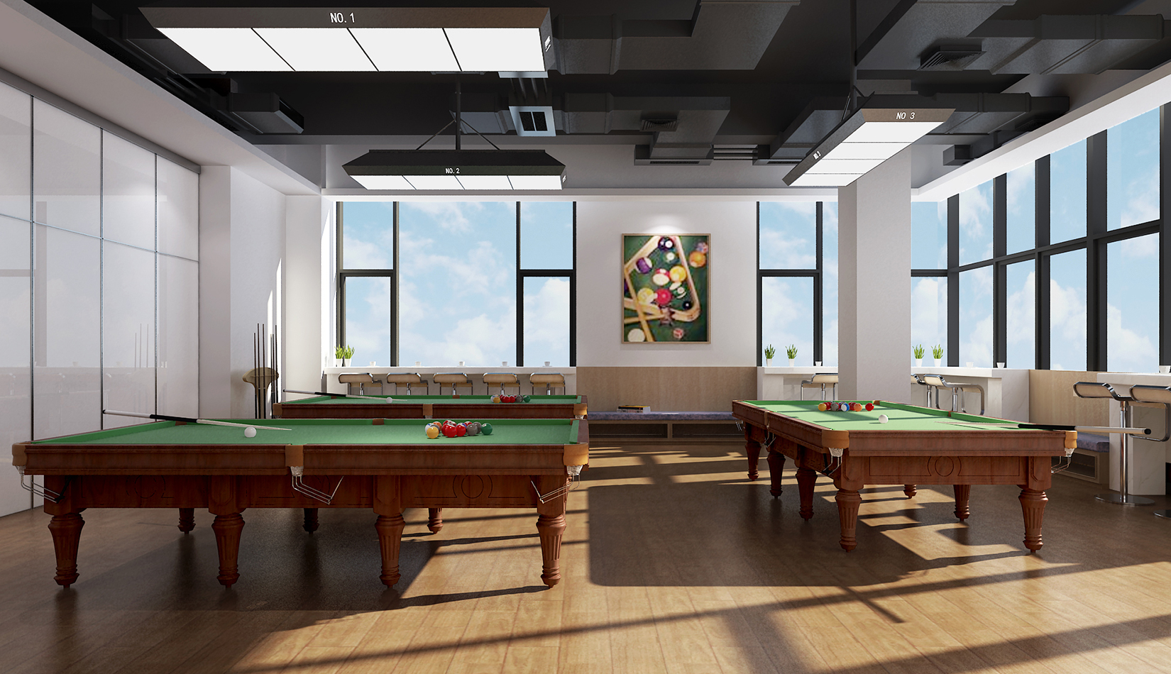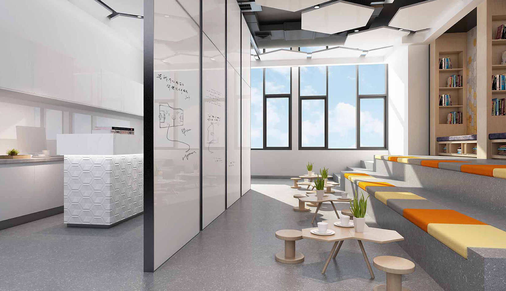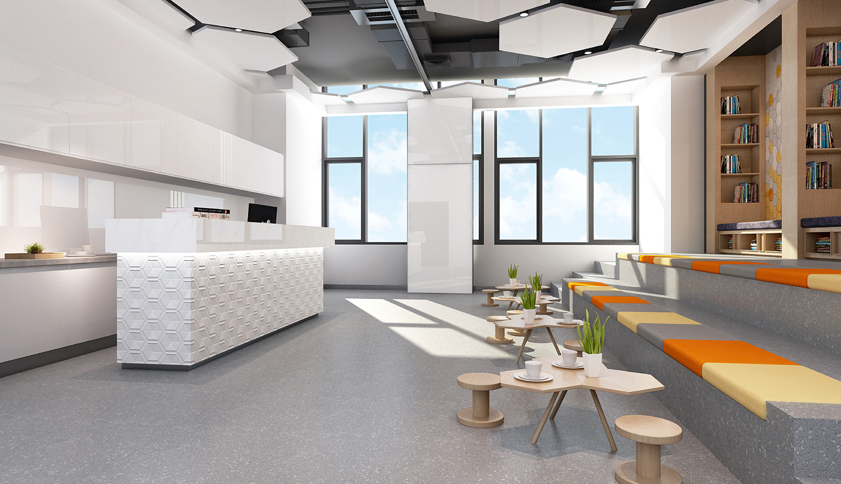一層大廳提取足球六邊形元素作為墻面背景,在此設(shè)計(jì)人行坡道,方便人流同行,并能形成較好的形式感。